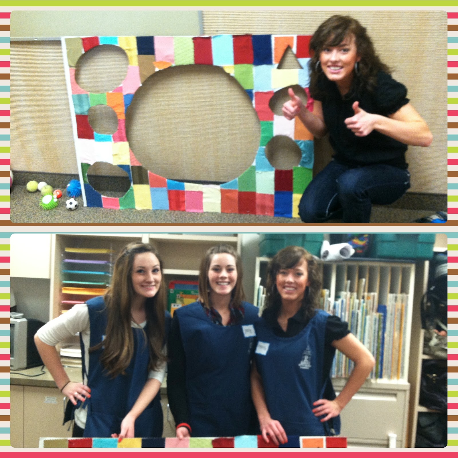 Say hello to my new life. :) jealous? haha. For my child 150 class we got to plan an activity and actually go into the preschool labs.! This is just a pre req class for the program so i was excited to go in for the first time. The theme that day they were learning about was balls! So my group decided to do a ball toss! We bout this science poster board and i covered it with free samples of fabric and cut out the wholes, we had a beach ball, football, volleyball, and a bunch of fun small balls of jaden and connor's that i borrowed(thanks:) This poor poster went through so much and ended up looking kinda homely but i figured the kids wouldn't care and ill learn from this haha. It was soooo fun i loved it!! i cant wait to start the program!